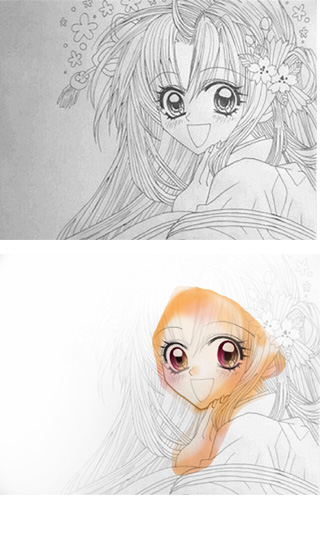 FRモバイルでいま勢いのある投稿戦士「ゆあら」さんの作品です。 上の白黒画像ですね。今回はこの作業工程を説明してまいります。 まず初めに、モバイル画面から携帯のデータ保存にグラフィックホルダに保存しました。 そしてそのほかほかデータちゃんを自分のパソコンさんにメール添付で送信しました。 携帯はあーうーのSH001です。 モバイル投稿を頑張りたくて、新規に購入したお気に入りのモデルです。 800万画素?がうたい文句でしたっけ? そして、パソコンはビスタさんです。めさめさ画面がでかいです。 そして今回使用したソフトは、フォトショの6.0です。 使い慣れるのに2年かかりました。でも・・・まだ使えてないツールも沢山です。 なんとも奥深いソフトですね。 まず初めに頂いた線画キャラですが・・・リボンのキャラみたいでかなり検索しました。 髪の毛ピンク色だと思っていたら、茶色でしたね。目がなんか赤かった! 1.線画をとる 白地と線画の境目がとれなかったです・・・。 画面が薄暗く・線画が薄い・・・。これはやりがいがある!! 左端のグレーで出来てしまった、グラデをひたすら消しゴムでけしました。 そして選択範囲で、黒味を取り、新しいレイヤーに塗りつぶしですよ。 それでも薄かったからレイヤーの複製で何回か乗算しました。 そしてさらに新しいレイヤーに白で、画面全体を塗り潰した後にソフトライトでかぶせたしだいです。 2.色を入れていく 線画の抽出がなんとなくですが終わりました。 肌色を塗りますが、私はまず塗りたい場所にはすべて暗いオレンジを置きます。 ムラや塗り残しがないようにするためです。 オレンジで塗った後に、その部分だけ選択して、肌色で塗り潰しをおこないます。 そしてそのレイヤーの上に新規でレイヤーを作りグループ化しました。 なんとも普通のやり方ですね。この、万人向けのやり方しかしきれません。 それを繰り返していきます。 |