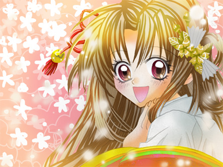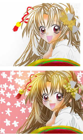 前回紹介したゆあらさんの作品制作ですね。 3.髪の毛を頑張る 今回髪の毛が一番の難所でした。 今までこのように大量の流れる髪の毛を塗ったことがありませんでした。 どこまでが髪でどこからが背景かわからませんでした・・・。 もうこれは、飛びっこの感でブラシツールで感覚10でペンタブレットを上からしたに 流しまくりました。はみでたところは消しゴムツールで修正です。 そして新規レイヤーにオレンジを70パーセントで覆い焼きカラーしました。 髪の毛の光部分がソコですね。 4.着物をどうにかしよう 平安時代??江戸時代?? ここはよくわからないからそれっぽい色におちついています。 ぶつぶつのブラシで模様っぽくしましたが、携帯では小さすぎて表示されていません。 5.小物ですね。 髪飾りはカラフル自然色にしないで、金細工にしてみました。 あまりにもカラフルな画面は目が疲れると思ったので、たまにはいいかもしれませんね。 6.背景はピンク 背景はまずピンク色で画面全体を塗り潰しています。 そして100セントのブラシツールで、桜の花に見えそうな花のシルエットを手描きで一つ一つ 書き込みました。 たくさん描いたら、軽くとりっぷしました。 この同じものを続けるということは、そのうち描く行為がたんなる作業になってしまうという恐ろしいまほうです。 画面にたまにこんな現象におちいりますが、がんばって逃げました。 そしてうだうだしているうちに一枚目の背景が終わりました。 次に、その、背景をレイヤーの複製で背景の上にもってきて右にすこしずらして、濃度40パーセントくらいにしました。 |